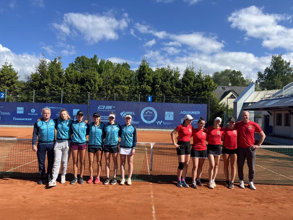 Stretnutie sa hralo s loptami Dunlop Fort all court. Začalo sa o 9:00 a skončilo o 15:00. Foto zľava: kapitán domácich Miroslav Petrech, domáce družstvo : Bohunčáková Stela, Suchánková Sara, Čisovská Romana, Husárová Martina, Knapová Tamara, družstvo hostí Georgievska Hana, Bordás Patrícia, Jávorková Karin, Mášiková Natália, kapitán hostí Jávorka Zoltán.
